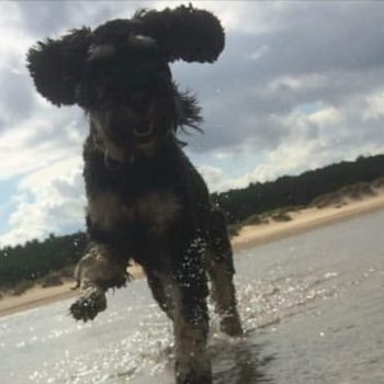He loves his walks especially if there is water. He can sniff the dirtiest puddles out from a mile off. He can out manoeuvrer a grey hound and loves doing the doodle dash.